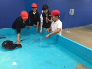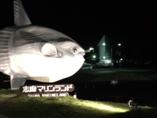 志摩マリンランドの入り口のオブジェは、マンボウです。その奥にある木もマンボウ型に剪定をしてあるそうで、遠くから二つを眺めると、マンボウがキスをしているように見えるそうです。