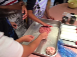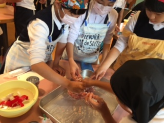 ミニブタショーの後は最後の体験、ソーセージ作りです。説明を聞いた後、8人ずつのグループに分かれ、豚肉のミンチをまぜるところから始めていきました。