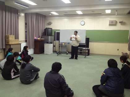 12月18日(水)放課後、教職員がアレックス先生から、英語活動の指導法をいろいろ学びました。2チームに分かれてゲーム形式で競い合ったり、順番に答えたりと、わくわく、ハラハラ、ドキドキしながらの楽しい1時間でした。最後はフラダンスを踊って終了。今日学んだことを参考に、子どもたちにも、楽しく役に立つ英語を工夫して教えていきたいと考えています。