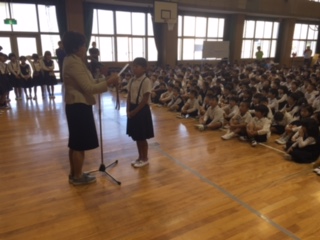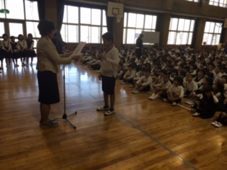 枚方市のわんぱく相撲大会で1位の5年A君、キックベースボール大会で優秀選手賞をもらった5年Fさん、同じく第3位になったチーム全員に、表彰状とメダル、トロフィーなどを渡して紹介しました。友達が頑張っている姿を見て、ともに喜び、自分も何かで頑張ろうと思ってくれるとうれしいです。いろいろな子どもたちの頑張りをこれからも紹介していきます。