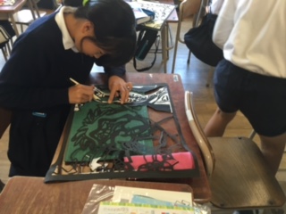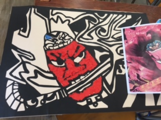 切り絵に挑戦しています。「青森ねぶた」を参考に、カッターナイフで切り取り、顔や体の部分に、ちぎった和紙を張っていきます。11月の作品展をお楽しみに!
