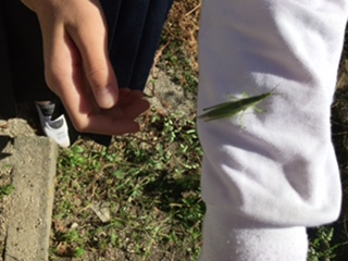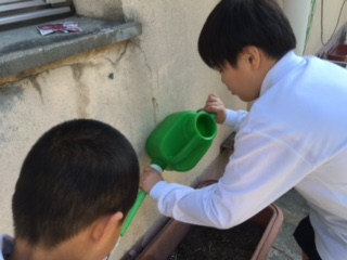 みんなで協力して種を蒔き、水やりもしました。学習園には、バッタもいました。オシロイバナの種を見つけた1年生は、「教室のみんなにあげる」と、たくさんポケットに入れていました^ - ^