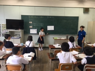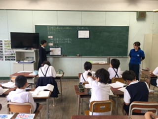 算数の時間、少人数指導の授業を公開しました。問題を見て、子どもたちは、「分数と小数の混ざった計算の仕方を考えよう」というめあてを自分から見出し、見通しを立ててどんどん進めていきました。小数にして考える方法と分数にしな考えるという2つの考え方をそれぞれ説明しました。練習問題をする中で、小数に表せない数もあることもわかりました。