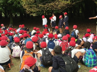 全グループがゴールし、終わりの会をしました。たてわりグループでお弁当を食べ、一緒に鬼ごっこなどをして遊びました。その後は、学年ごとにドングリや落ち葉を拾ったり、遊具で遊んだりして帰校しました。