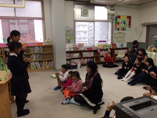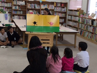10日、委員会活動の時間に、図書委員会児童が、図書ボランティアさんの応援を受けて「みんなあつまれ〜!」の催しを行いました。地域の子育てサロンに集う子どもたちを招待し、絵本の読み聞かせや手遊び歌を一緒に歌うなどをしています。スタートしてから今年で10年目になります。天候があまりよくなく、参加者は、少なかったのですが、図書委員会の子どもたちは、小さいお客さんたちに一生懸命大型絵本を読み聞かせました。