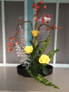 土曜日、お花の教室がありました。今月の花を活けてくださっています。赤く見えるのは、月桃(げっとう)の実です。