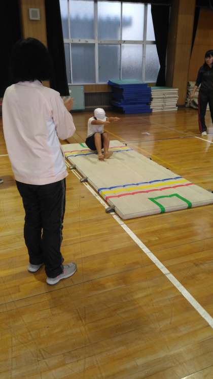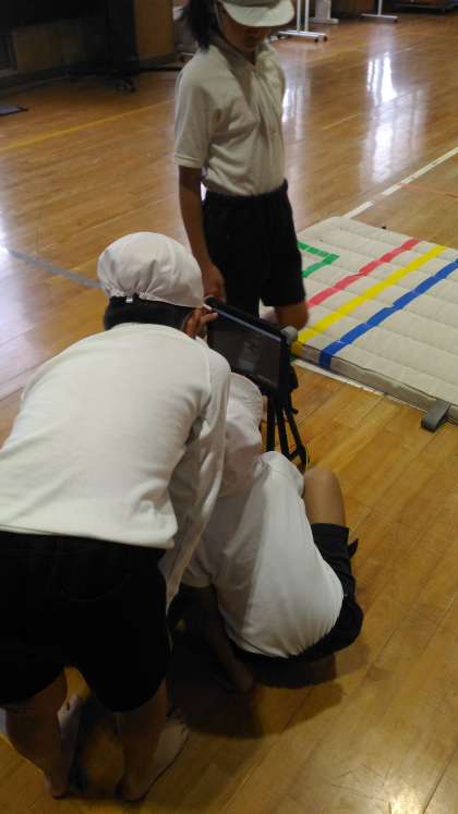 マット運動の後転に取り組みました。一回取り組む毎に、タブレットを使って、自分のめあてと動きが合っているか確かめます。