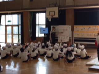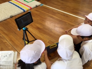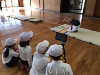 はじめに今日のめあてを確認した後、グループに分かれて、1人ずつ自分が気をつけるポイントを言ってから技を見せます。タブレットで録画したものをみんなで見て、よかったところ、改善点などを教えあいました。