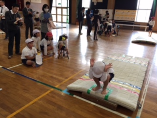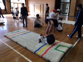 マットの反対側には、跳び箱の踏切板を入れて坂になるようにしています。後転をしやすくするためです。子どもは、自分でどちら側から回るか決めたり、時には友達のアドバイスで変更したりしています。きようの技のめあてが達成できたら白帽から赤帽に変えます。