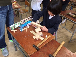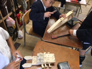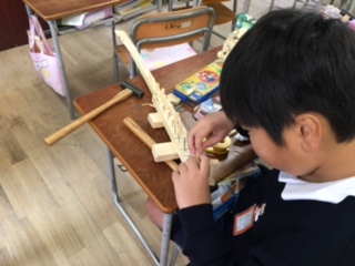ノコギリで木材を切ったり、釘で打ちつけたりして動物や乗り物などの作品を作っています。