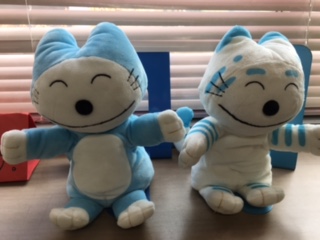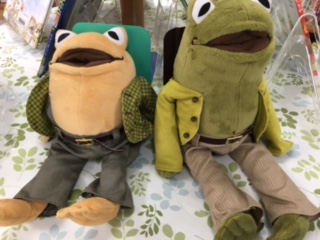 絵本の登場人物のぬいぐるみやパペットをおいていまさ。「かわいい!」と手に取る子どもたち。一緒に本の世界へどうぞ。