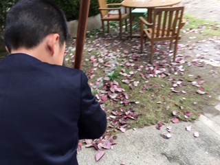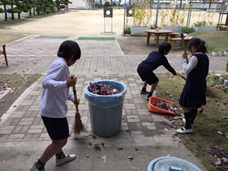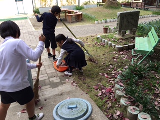 一昨日の雨で、中庭のアメリカンハナミズキの葉がたくさん散っていました。掃除の時間、玄関を担当している4年生の子どもたちが一生懸命掃いてくれました。きれいになりました!