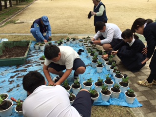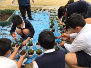 パンジー以外にもストック、ノースポール、金魚草なども飼育栽培委員会の子どもたちが、種まきをしたところ、たくさん育ちました。ボランティアさんのおうえんで、植え替えをしました。玄関、中庭などたくさんのプランターや鉢が並びました。「美しい学校に!」との願いがさらに広がるとうれしいです。