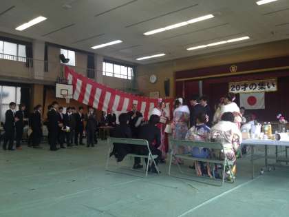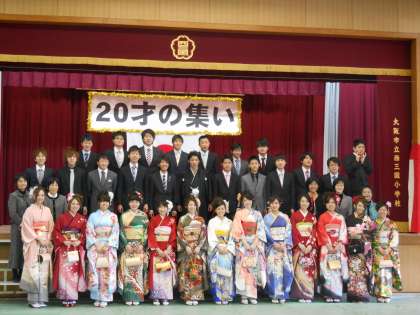 新成人を祝う「20才の集い」が、本校講堂で開催されました。毎年、西三国社会福祉協議会の方々が中心となって企画、準備、運営等を行ってくださっており、今年で31年になります。今日集ったのは、平成17年度の卒業生。当時の校長先生や担任の先生方もお祝いにかけつけてくださいました。小学生当時の思い出に花を咲かせたり、卒業アルバムに記した「将来の夢」を懐かしげに見入ったりする姿も。青少年指導委員の方々によるクイズコーナーもあり、和やかな語らいのもとあっという間に時間が過ぎ、一同は区役所主催の成人式会場へと向かいました。