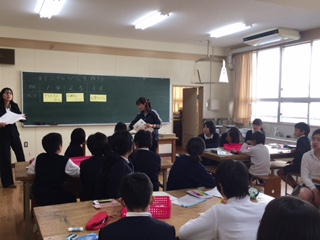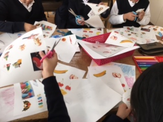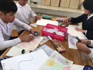 1組は、美術の先生が教えてくださいました。落ち葉や、レースペーパーなどの模様を色鉛筆で写し取り、切ったり貼ったりしてパフェを作ります。