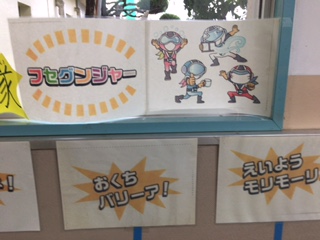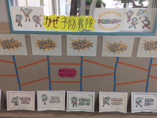 保健室前に、風邪予防の掲示物が。ゴレンジャーの登場で、風邪なんて何処かへ行ってしまいそう!!^_^