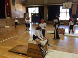 マットやとび箱を使った器械運動遊びの研究授業のプレを行いました。手のつき方、踏切の仕方など、お互いに見合って気づいたことを教えあいます。自分の動きを振り返り、次に繋げます。