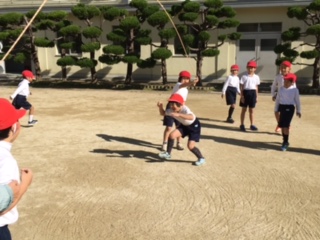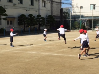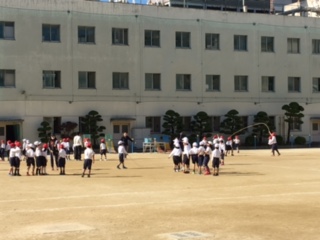学年で大縄とびに挑戦しました。大縄の中に入るのが難しい子も、友達の応援を受けて、えいっと気合を入れて、だんだんできるようになってきます。