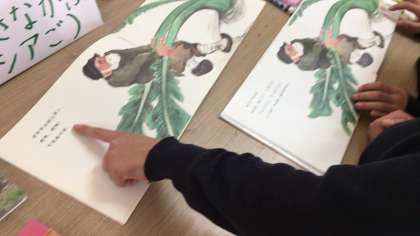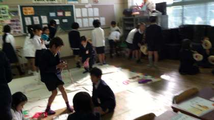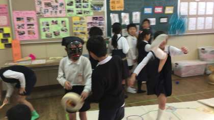 昼休み、今日は3年生が民族クラブの部屋を訪問しました。韓国・朝鮮の遊びや楽器に親しんだり、それ以外の国々の絵本などにも親しみました。