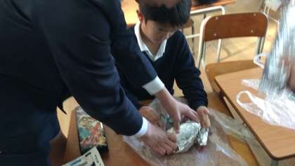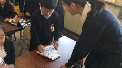 1年生の教室に6年生が教えに行きました。「こうしたらいいよ」「ありがとう」優しいふれあいの場面です。