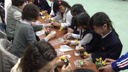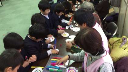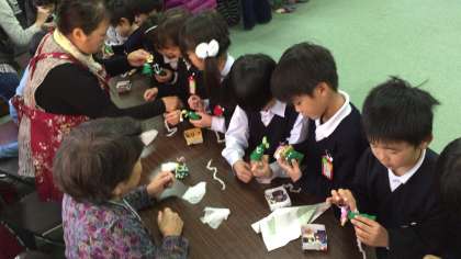 多目的室では、小物作り。フェルトや紙皿などで袋やコマ、飾りものを作りました。作ったものは家に持ち帰りました。地域の諸団体のみなさんに教えていただきました。