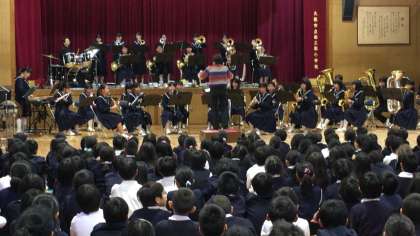3時間目は、三国中学校の吹奏楽部の皆さんの演奏を聴きました。クリスマスソングのメドレーや、アニメの主題歌など子どもたちが楽しんで聴くことができる曲を選んでくださいました。卒業生もいて、「すごい!あのお姉ちゃん知ってる!!」と。
