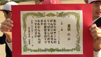ドッジボール大会の優勝チームに送られた表彰状です。みんなで力を合わせた結果ですね。おめでとう!