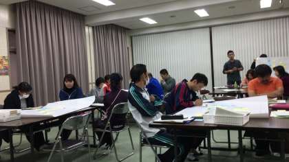 放課後授業についてみんなで振り返りをしました。三国小学校のH校長先生を講師に迎えて器械運動に関する系統指導や感覚運動遊びなどについてくわしくご指導いただきました。