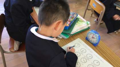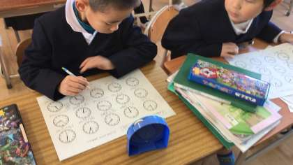 時計の読み方について学習し、練習プリントをしています。お家でも今何時?と時計をよむ機会を多くしてみてくださいね。