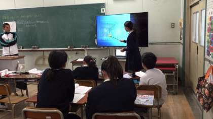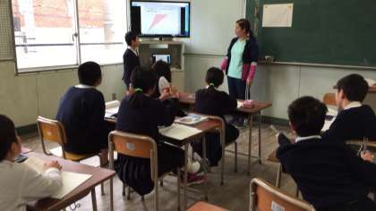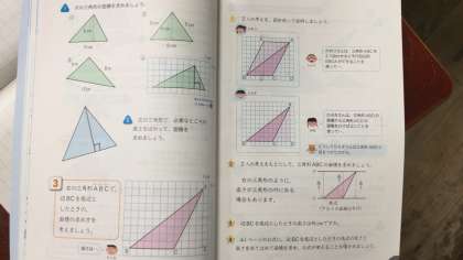 三角形の面積の求め方を考えました。三角形を2つ合わせて平行四辺形にしたり、分割したり、いろんな方法を考えました。少人数で授業しています。