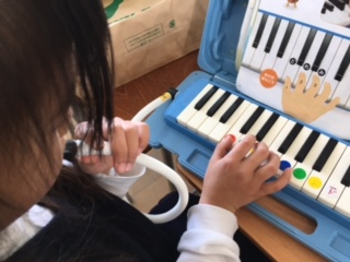 ピアニカの練習をしています。手のひらを、たまごを持っているようにまあるくするのがポイントです。上手にできる子は、近くの子に教えにいきました。