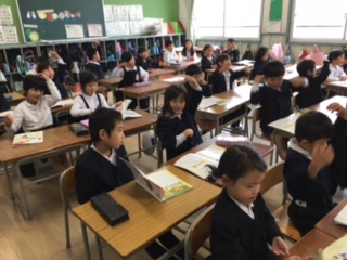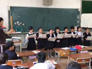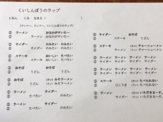 リズムに合わせて「くいしんぼう ラップ」を2つのチームに分かれて歌ったり、「アイアイ」を振りをつけて表現したりしました。言葉のリズムに乗って楽しそうです。