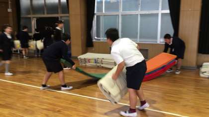 年末にはいつも地域の体育施設開放委員会の皆さんが、体育館の床やギャラリーの清掃をしてくださっています。床はワックスがけをするので、5年生が体育道具を全て倉庫に片付けました。