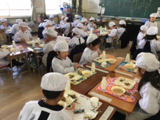「久しぶりの給食、おいしい!!」と1年生。お代わりもたくさんしています。