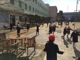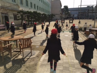低学年の子どもたちが、かわりばんこに中庭でなわとびをしています!