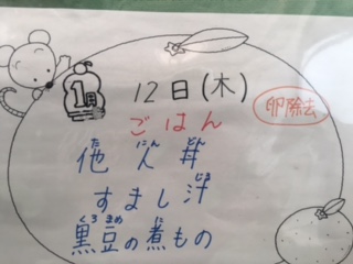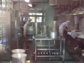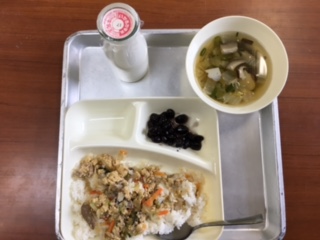 調理員さんが一生懸命作ってくださっています。今日の献立は、他人丼、すまし汁、黒豆の煮物でした。