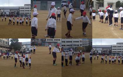 今日の5時間目は、1年2組と6年2組がペアで大縄とびに挑戦しました。なかなか難しく回数も跳べないようでしたが、6年生がほめたり、励ましたりしていて、1年生も一生懸命チャレンジしていました。とてもほほえましい光景でした。