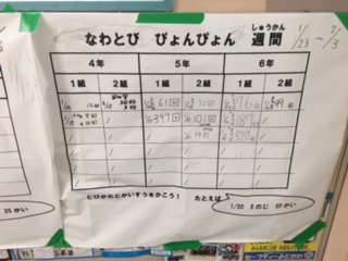 一階の廊下になわとびの記録用紙を貼り出しています。