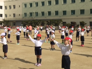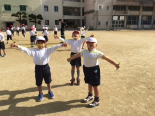 先週、京都大学の縄跳びサークルの学生さんが、1年生になわとびを教えてくださいました。前跳びや後ろ跳びに挑戦している1年生に、最後の決めポーズを教えてくださいました。学生さんのカッコイイポーズに、大歓声!一生懸命練習しました。ますますなわとびに親しみがわいた1年生でした^_^