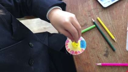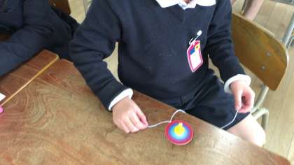 コマに色を塗って、ひもで引っ張って回します。糸の押さえ方とひもを引っ張るタイミング、力加減が微妙です。「名人」も出てきました!教えあいをしています。