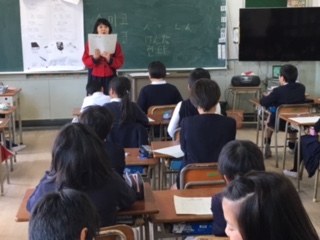 ソンセンニムに韓国・朝鮮の言葉や文字について教えていただきました。簡単な買い物の仕方について、客と店員になって会話をしたり、ハングル文字で自分の名前を書いたりしました。
