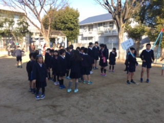今日の土曜授業は、地域合同防災訓練でした。午前8時に地震発生、津波の予報が出たとの想定のもと、各町会ごとに子ども達は、一時避難、それから学校へ二次非難をしました。