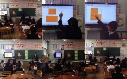 4年2組で算数の「L字型のような面積の求め方」の研究授業を行いました。ICTを活用して課題をつかみ、一人一人がノートに自分の考えた方法で解き、隣同士で説明をし合いました。その後、学級全体に電子黒板や書画カメラを使って説明を。練習問題も電子黒板で確認でき、子どもたちは、楽しく、よくわかったとにっこり。