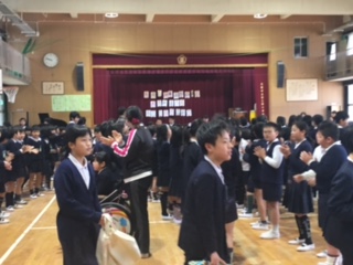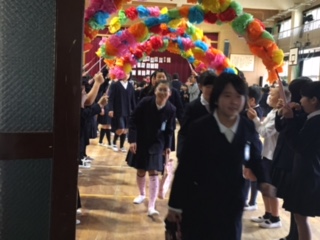 みんなに見送られて6年生が退場です。ちょっぴり涙を流している1年生の姿も。企画、運営に当たった児童会の子ども達、素敵な会となりました。ご苦労様、ありがとう!!
