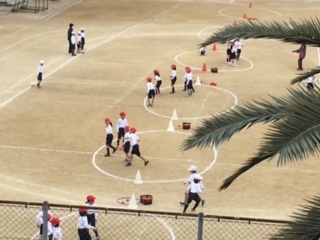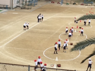 たまごわりサッカーを2クラス合同でやりました。真ん中にいる相手にボールを止められないように、蹴ると点が入ります。だんだん慣れてきて、得点できるようになってきました。