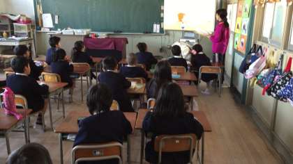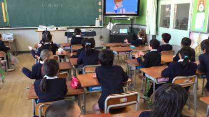 1時間目が始まる前の時間に、全学年で英語の勉強をしています。映像に合わせて、発音したり、ジェスチャーしたり。楽しく学んでいます。