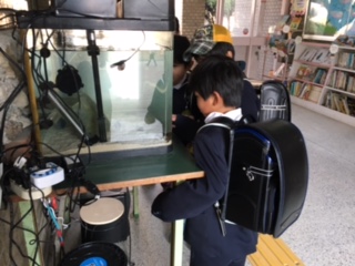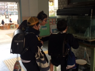 登校してきた子ども達が、水槽を覗き込んでいます!