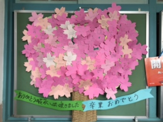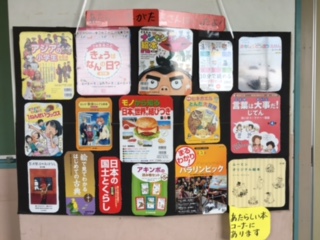 1年〜5年生が書いた、6年生へのメッセージをM先生がきれいにディスプレイしてくださいました。新しく入った本の紹介もあります。