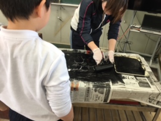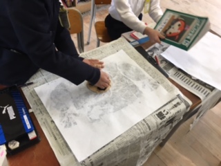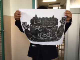 紙版画で、鬼を表現しました。目や眉、口など形や大きさなど自分の思いを表現しました。