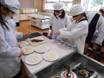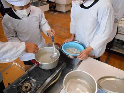 3学期の調理実習は、「白玉団子」づくりです。水加減に気をつけながら白玉粉をまぜ、そのあと、みんなで協力して丸めました。いろいろな大きさや形に丸められた団子を沸騰したお湯に入れ、そのあと冷やして完成です。できあがった団子のつやは何ともおいしそうで、子どもたちの食欲は一気に最高潮に達しました。あんこやきなこ、砂糖醤油で味付けをして食べたのですが、たくさんあった団子は、あっという間に子どもたちのおなかの中に消えてしまいました。